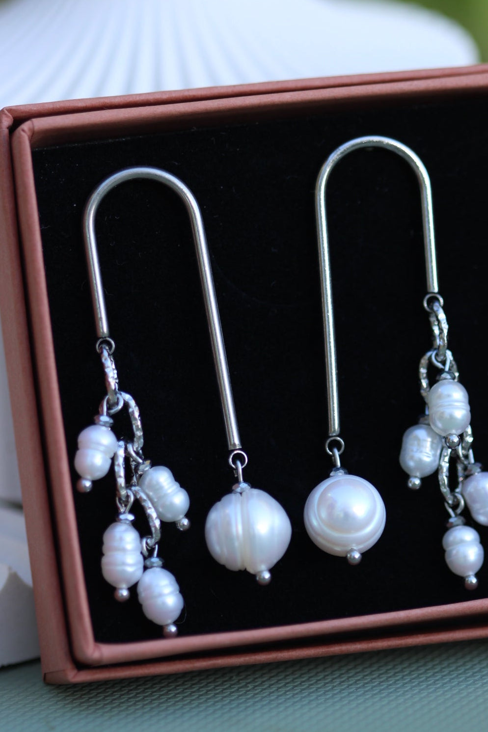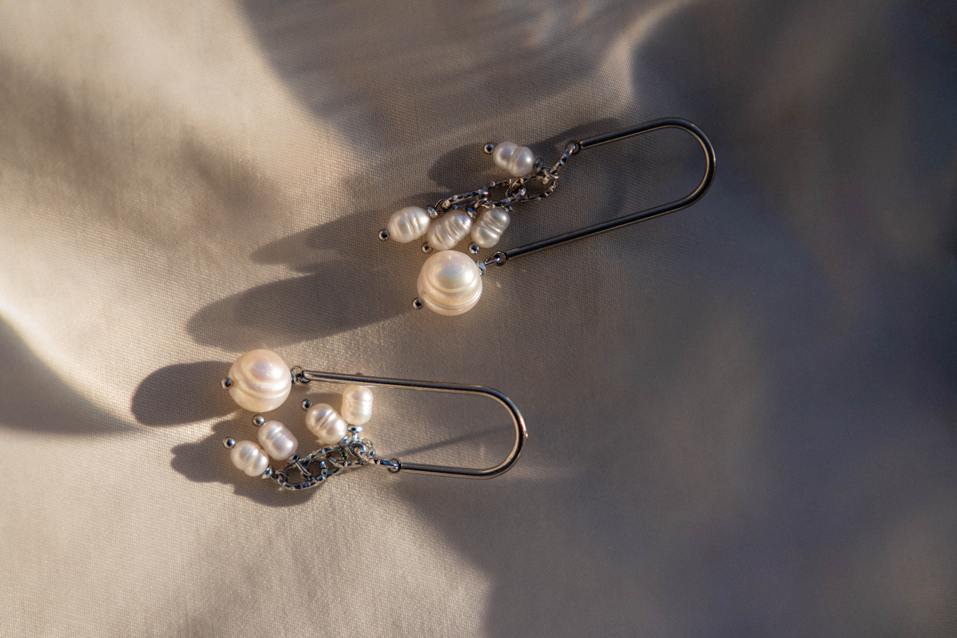 Bazą kolczyków jest łuk wykonany ze stali nierdzewnej, o nowoczesnej, czystej linii. Geometryczna forma kontrastuje z organicznością naturalnych pereł o zróżnicowanym kształcie, dzięki czemu każdy kolczyk jest inny, a całość nabiera artystycznego charakteru. Perły poruszają się przy ruchu, subtelnie odbijając światło i dodając kompozycji dynamiki.