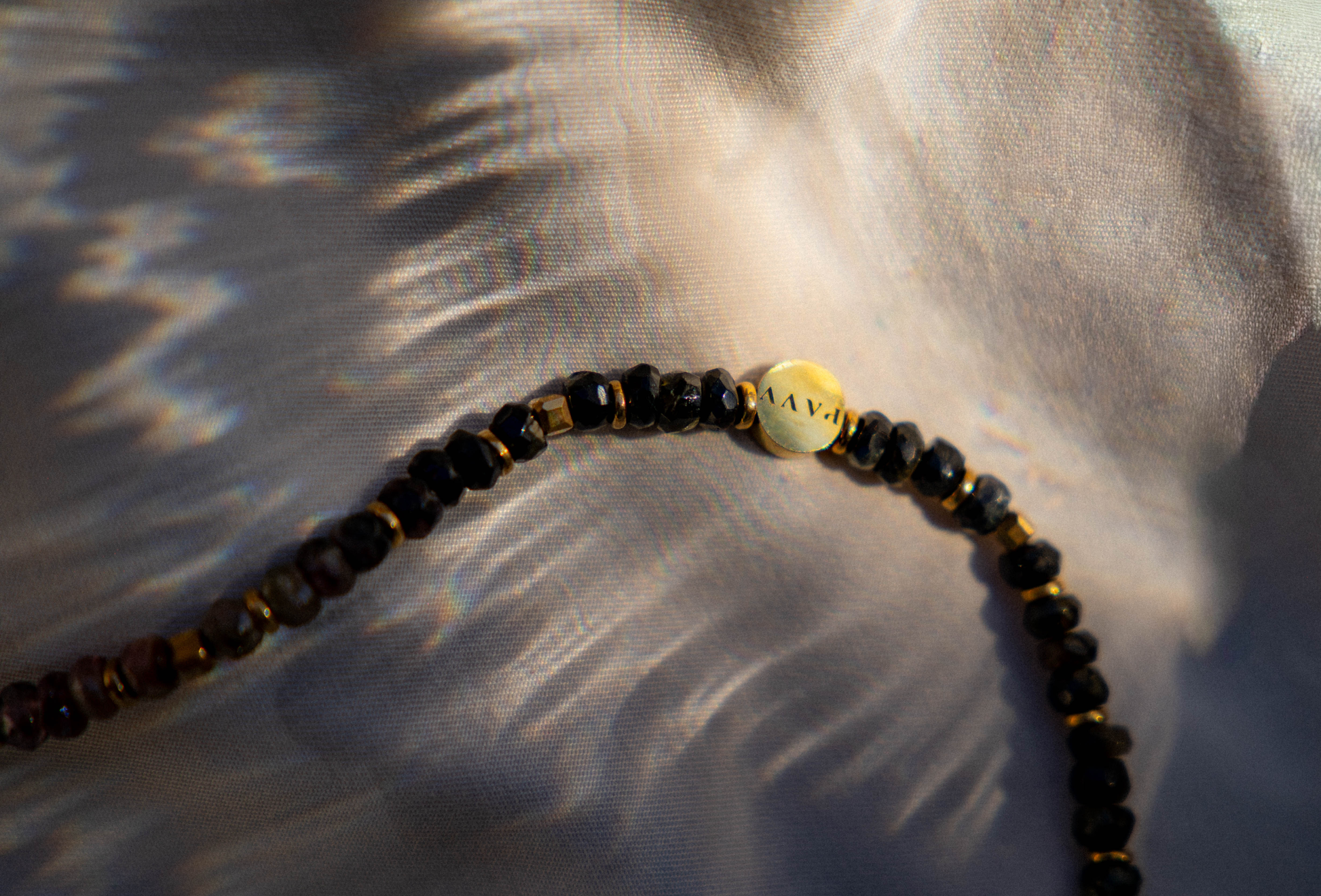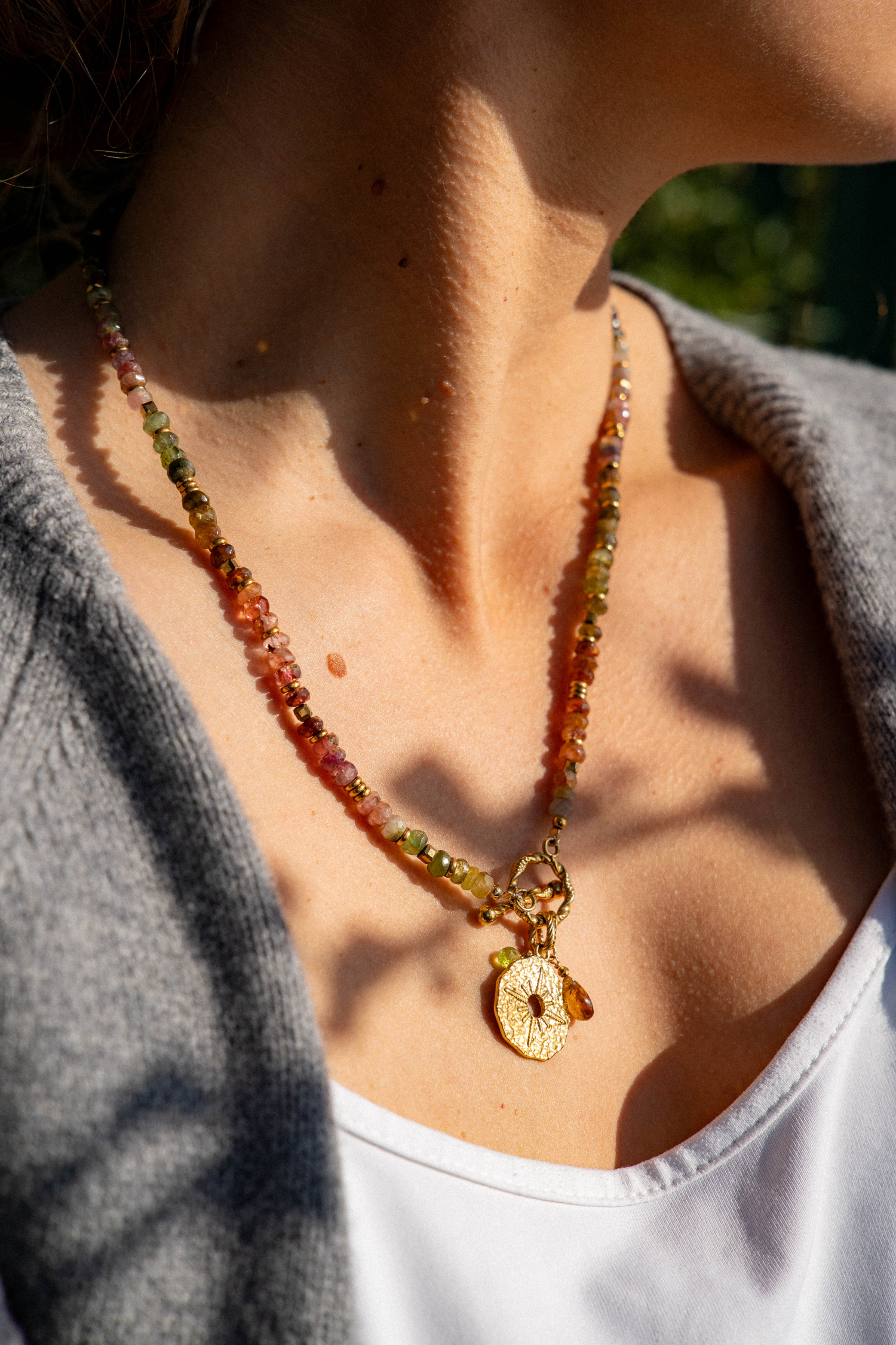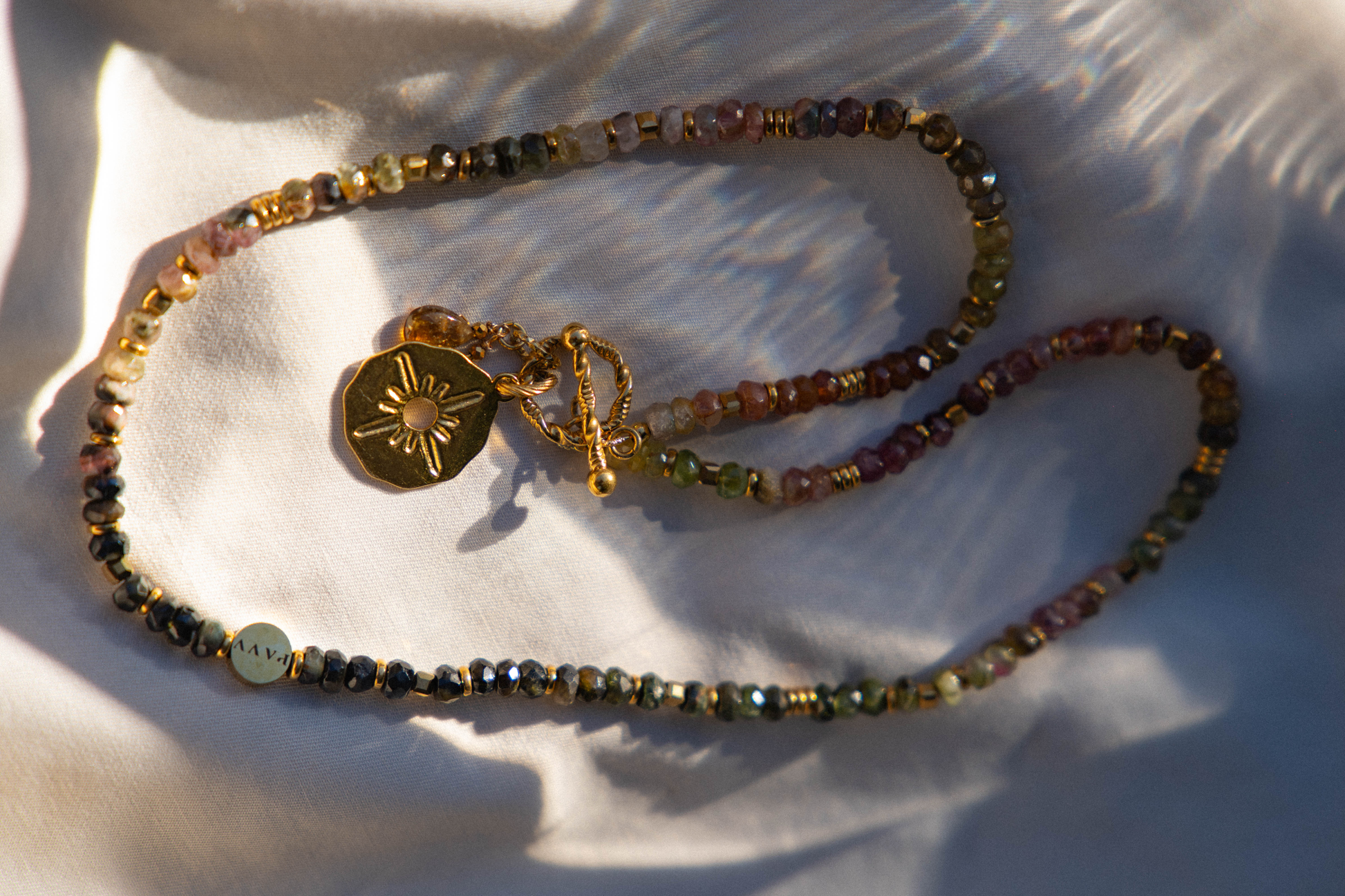 LUDOVICA to naszyjnik, który łączy w sobie ciepło światła i naturalną harmonię kamieni. Wykonany z wielobarwnego turmalinu, zachwyca subtelną grą odcieni — od zieleni, przez miód, aż po głębokie brązy. Centralnym punktem jest zawieszka w kształcie słońca, symbol energii, życia i wewnętrznej siły.
