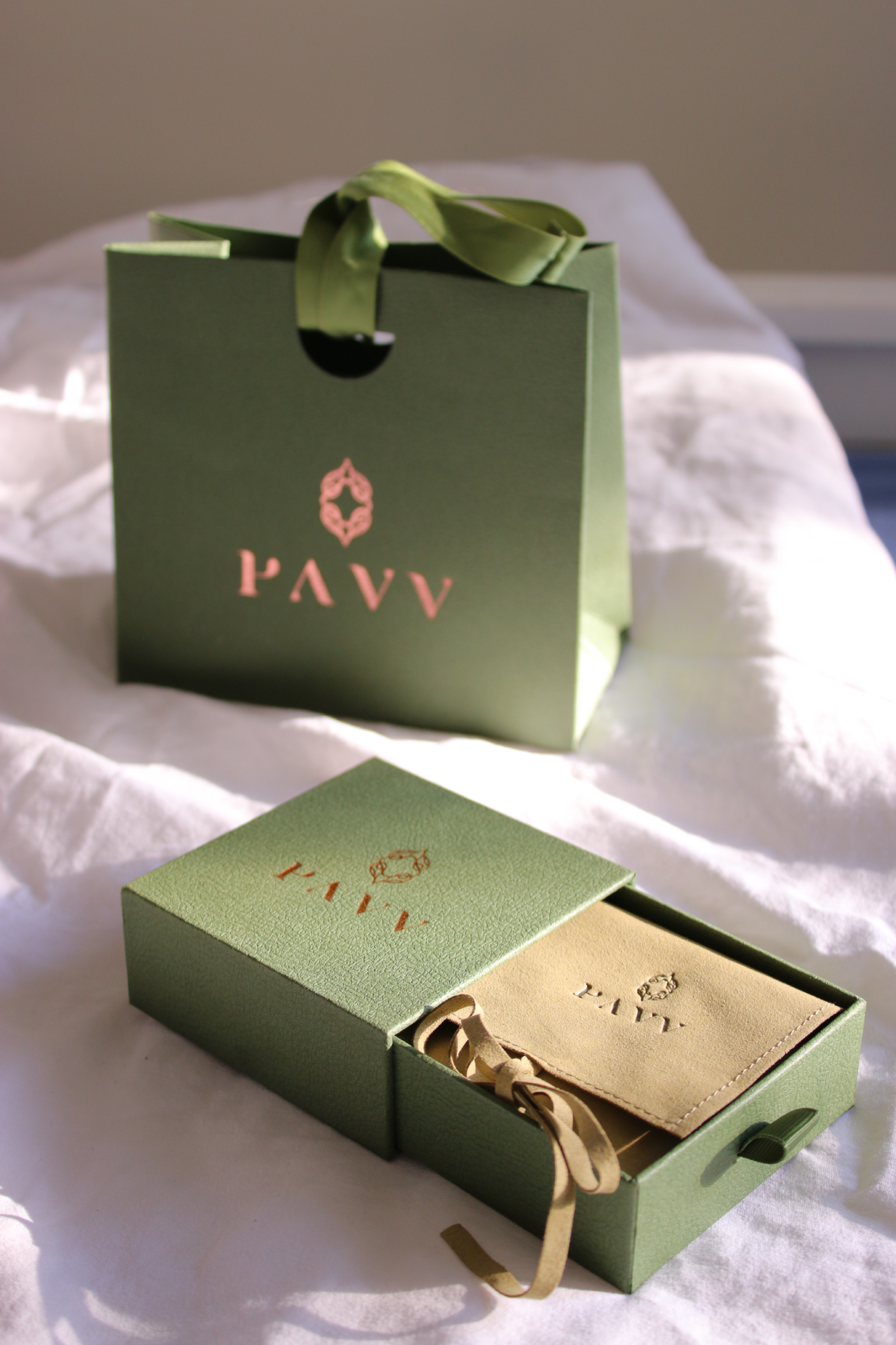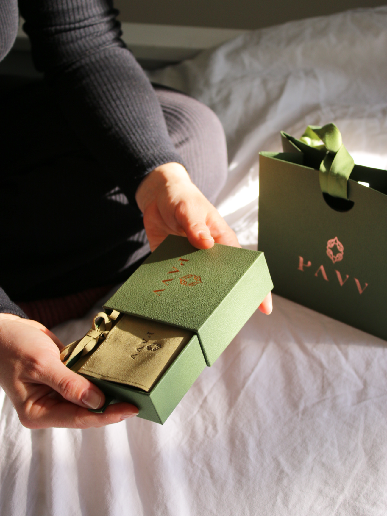 Podkreśl wyjątkowy charakter swojego prezentu dzięki ekskluzywnemu opakowaniu PAVVONI. Zestaw składa się z eleganckiego, wysuwanego pudełka oraz dedykowanej torebki prezentowej w odcieniu głębokiej zieleni. Całość została zaprojektowana tak, aby tworzyć spójną, luksusową oprawę dla biżuterii.