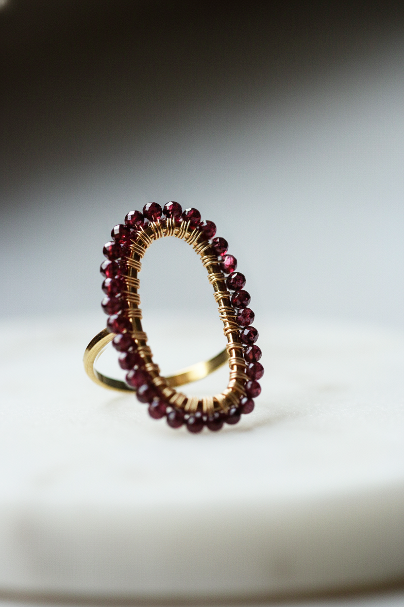 Długi, zmysłowy i pełen tajemniczej mocy – ręcznie pleciony pierścionek z mikro-fasetowanych kulek głęboko bordowego granatu (wielkość 2 mm). Kamienie układają się w subtelny, podłużysty kształt, który wydłuża optycznie palec i daje efekt eleganckiego, kobiecego „pazurka”. Kolor jest tak intensywny, że w świetle mieni się od krwistej czerwieni po niemal czarną, aksamitną głębię. Baza ze stali chirurgicznej, w pełni regulowana – idealnie dopasuje się do Twojego palca. Pierścionek jest wygodny i zabezpieczony od spodu – nie drapie i nie haczy.