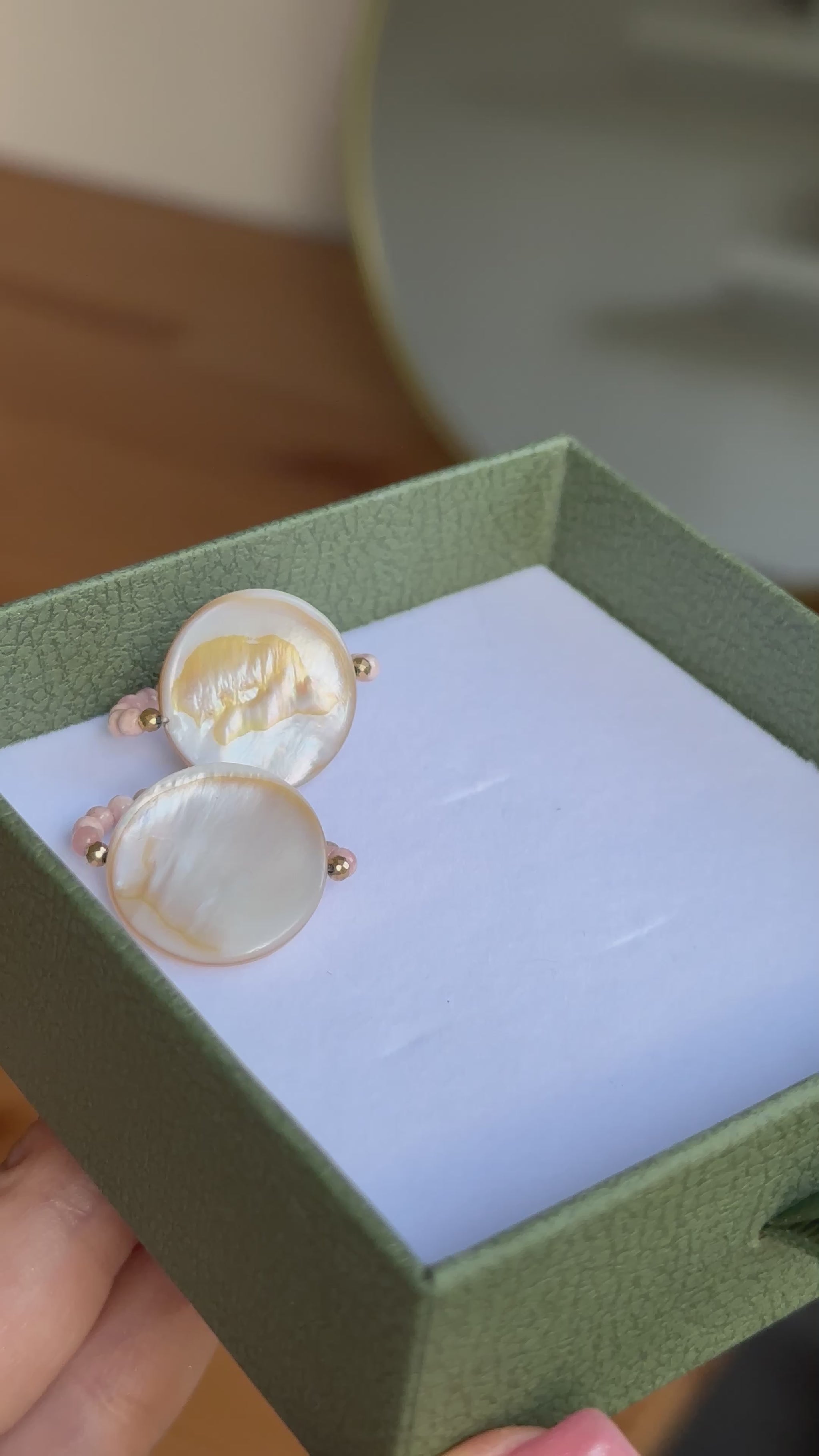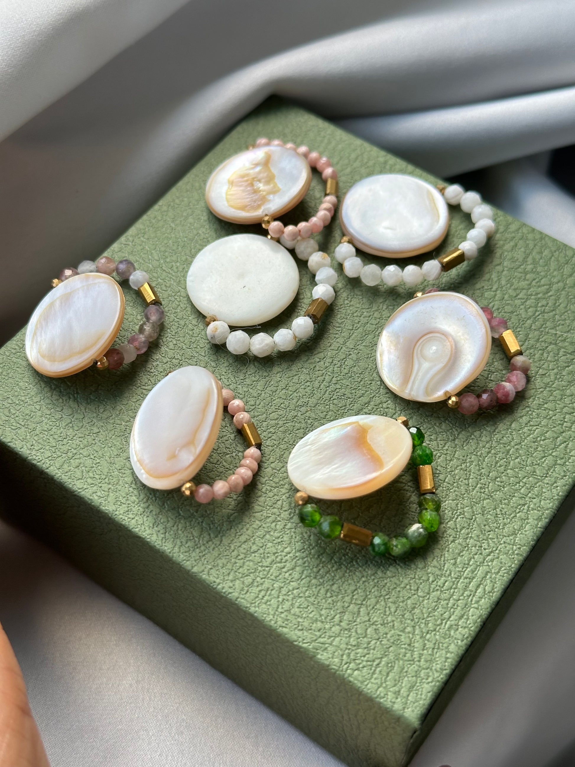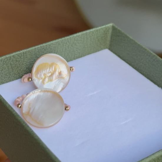 Pierścionek z dużym krążkiem z muszli perłowej. Wykonany na mocnej, elastycznej gumce. W uwagach do zamówienia możesz napisać dokładny obwód palca lub rozmiar pierścionka.