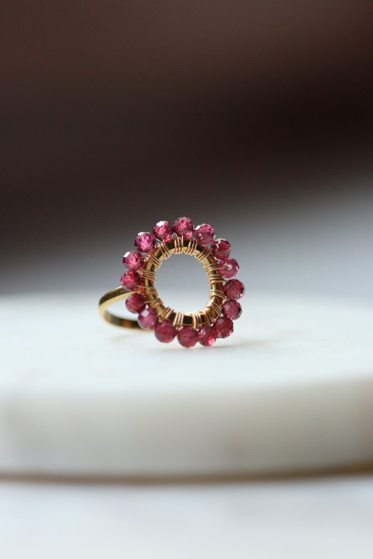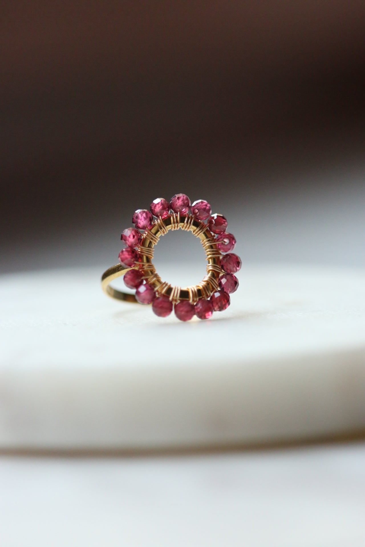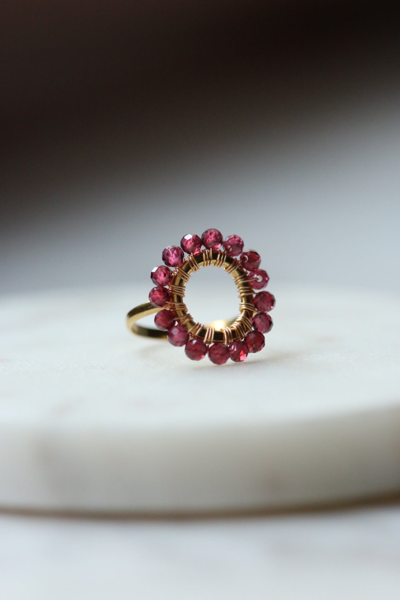 Drobny, idealnie okrągły pierścionek utkany z mikro-fasetowanych, głęboko bordowych kulek granatu (3 mm). Każdy kamień mieni się jak kropla czerwonego wina w świetle – od ciepłej wiśni po niemal czarną głębię. Klasyczna, elegancka forma w wersji mini, która wygląda jak subtelna, szlachetna aureola na palcu. Baza ze stali chirurgicznej, wielkość regulowana.