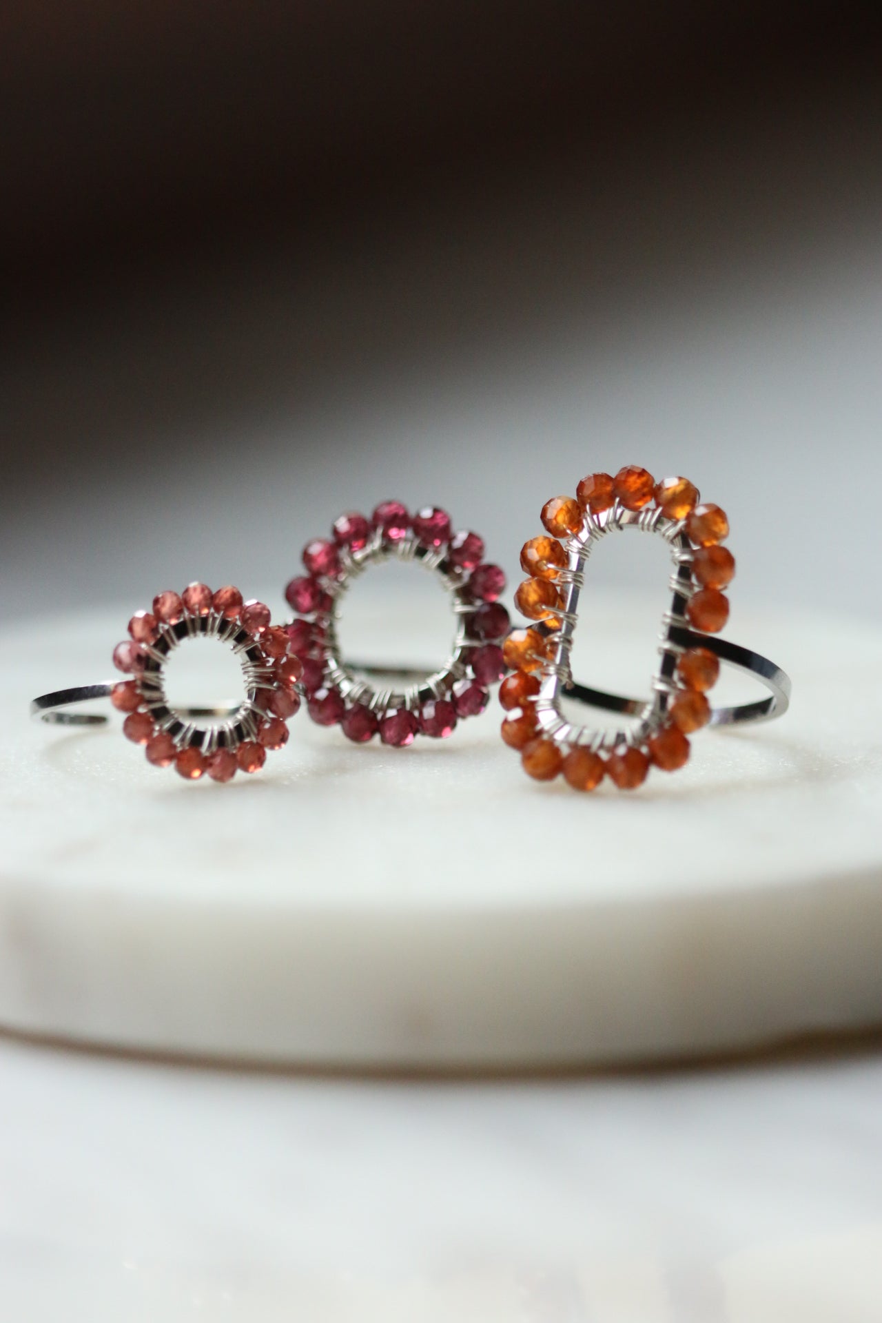 Drobny, ultra kobiecy i totalnie uzależniający – ręcznie pleciony, drobniejszy niż MIRA, z mikro-fasetowanych kulek głębokiego almandynu (tylko 2 mm). Bordowy błysk jest tak intensywny, że wygląda jak kropla czerwonego wina zamknięta na Twoim palcu. Delikatny, w wersji „petite” – idealny na serdeczny, mały palec albo jako najcieńszy element stacku. Baza ze stali chirurgicznej, w pełni regulowana, wygodna i zabezpieczona od spodu – nie drapie, nie haczy.