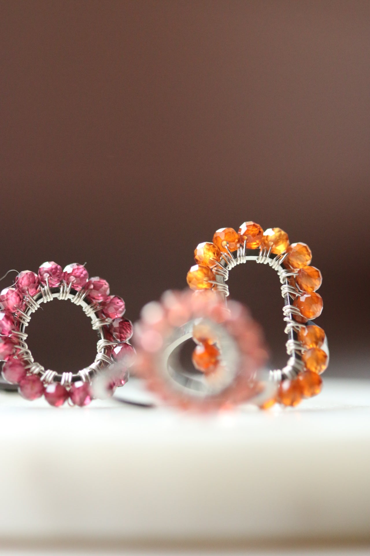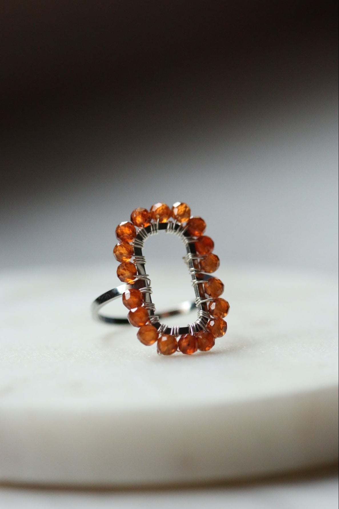 Ręcznie pleciony, ultra kobiecy pierścionek z błyszczących, soczyście pomarańczowych fasetowanych kulek spessartynu (3 mm). Każdy kamień mieni się jak kropla letniego słońca – od głębokiego bursztynu po radosny mandarynkowy błysk.